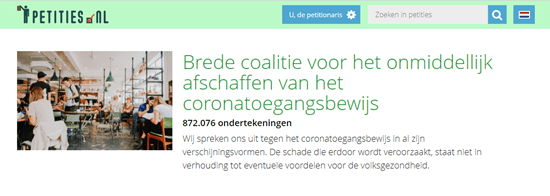 Heel erg bedankt voor je steun voor een Onverdeeld Open Nederland! Wij zijn blij dat onze coalitie, gesteund door de Vierde Golf, Studenten in Verzet, Privacy First, en vele anderen, inmiddels meer dan 870.000 mensen telt. Het is de snelst groeiende grote petitie ooit. En dat betekent wat. Het is niet onopgemerkt gebleven. Met het stopzetten van de toepassing van het coronatoegangsbewijs per 25 februari wordt een belangrijke stap gezet, maar we zijn er nog niet. De wet die het coronatoegangsbewijs mogelijk maakt blijft bestaan en ook de wet om het coronatoegangsbewijs uit te breiden naar de werkplaats ligt nog op tafel. Daarnaast is het plan om 1G in te voeren bij bepaalde evenementen. Het blijft dus belangrijk dat steeds meer mensen deze petitie tekenen!