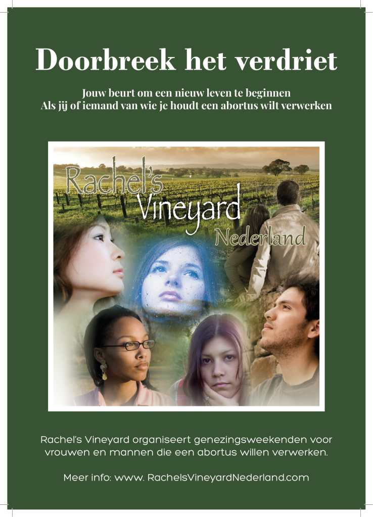 Het genezingsweekend: “Dit weekend helpt je om Gods liefde en barmhartigheid op een diep niveau te ervaren. Het is een plaats waar mannen en vrouwen, vaak voor de eerste keer, in een vertrouwelijke omgeving hun diepste gevoelens over abortus kunnen uiten en delen. Het is een plaats van verzoening. Deelnemers die wrok-gevoelens hebben ten opzichte van zichzelf of anderen, ervaren er barmhartigheid en vergeving, waardoor zij opnieuw in vrede met zichzelf en anderen verder kunnen. Een Rachel’s Vineyard weekend geeft je de…