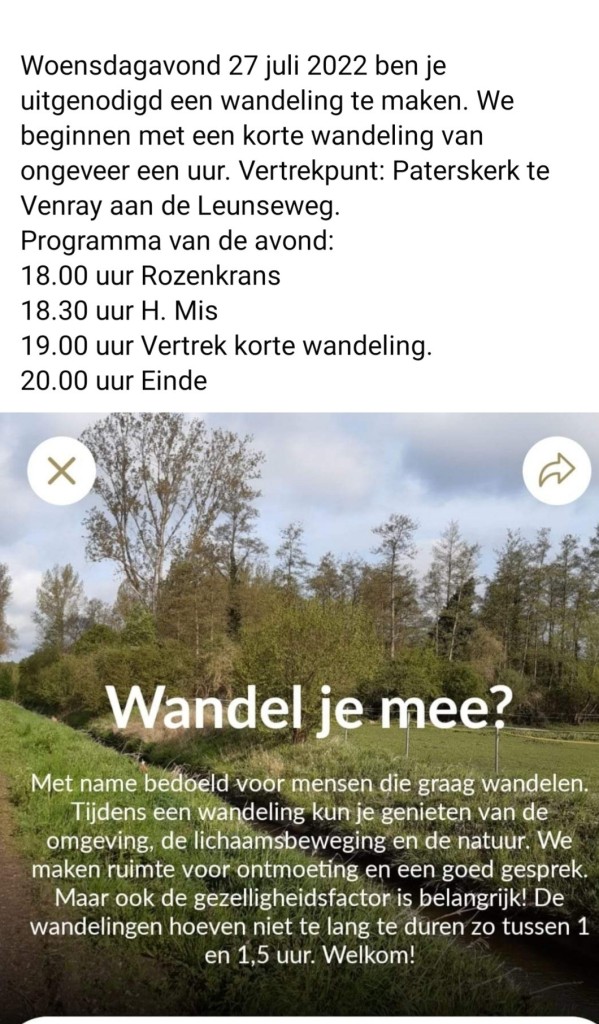 jul 26 Wandel je mee op 27 juli? Standaard Oog en Oor voor mensen in kerk en samenleving View original postDit delen: Klik om te delen op WhatsApp (Opent in een nieuw venster) WhatsApp Vind-ik-leuk Aan het laden...
