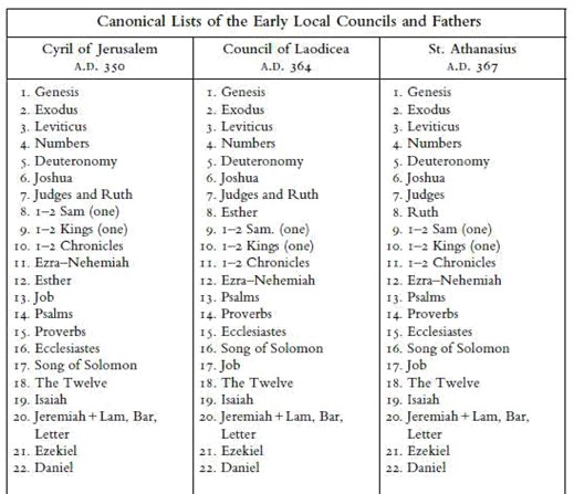 In de eerste drie eeuwen na Christus waren de exacte grenzen van de canon van het Oude Testament geen dringende theologische kwestie. Veel belangrijkere kwesties waren het opnemen van niet-Joden in de Kerk (Handelingen 15), de relatie tussen de wet en verlossing in Jezus Christus (Romeinen; Galaten) en het bewaren van de zichtbare eenheid van de Kerk (zie 1 Clement en de brieven van Ignatius van Antiochië). De tweede en derde eeuw werden gekenmerkt door veelvuldige vervolgingen van de gelovigen, die het voortbestaan van de Kerk bedreigde. Dit verklaart waarschijnlijk waarom we pas na de legalisatie van het christendom door Constantijn (313)[2], aan het begin van de vierde eeuw, lijsten beginnen te krijgen van de canon van de Schrift van verschillende kerkvaders en concilies. Aan het einde van de vierde eeuw werden de Kerken die in gemeenschap waren met Rome het eens over de canon die vandaag de dag door de Katholieke Kerk wordt erkend, zoals blijkt uit de Concilies van Rome (382), Hippo (383) en Carthago (397 en 419), en ook Augustinus.